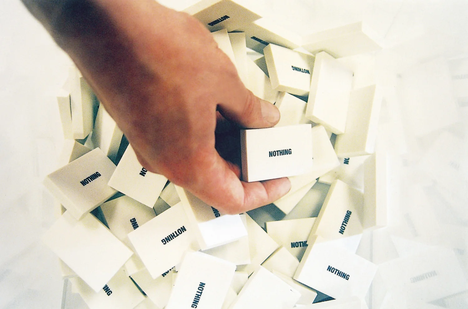 Edition of 1000 erasers produced for the touring group exhibition Nothing. The exhibition logo was printed on to the surface of each eraser. The whole edition was available from a perspex box on a plinth at the exit of the exhibition, as in the manner of a trade fair.